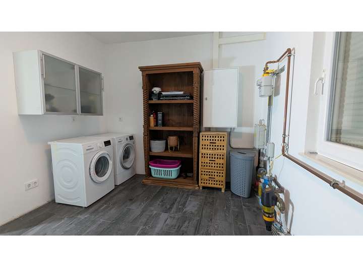 Das Haupthaus umfasst ca. 232 m² Wohnfläche sowie zusätzlich einen ausgebauten Spitzboden mit ca. 29 m² Nutzfläche, der dem Haupthaus zugeordnet ist und weitere Nutz- bzw. Abstellmöglichkeiten bietet. Das Haupthaus verfügt über mehrere Wohn- und Schlafräume, zwei vollwertige Badezimmer, einen offenen Wohn- und Essbereich mit integrierter Küche sowie einen Hauswirtschaftsraum. Eine Anlage zur solaren Warmwasseraufbereitung ist vorhanden. Terrasse und Gartenbereich runden das Angebot ab.