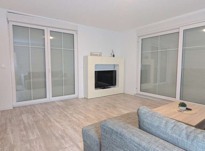 Anliegerwohnung: Separat zugängliche Wohneinheit mit Wohnbereich, Schlafzimmer, Badezimmer und einer Küche.