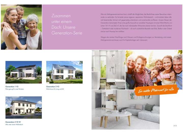 Im Mehrgenerationenhaus Generation 1 treffen zwei bemerkenswerte Hausvarianten aufeinander: der Winkelbungalow und das Satteldach im Haupttrakt. Hier können Sie leben, spielen und arbeiten - alles in einem harmonischen Umfeld. Ob Sie es als Einfamilienhaus oder als Wohnform mit Einliegerwohnung (Generationenhaus) nutzen möchten, dieses durchdachte Raumkonzept erlaubt beides auf eine stilvolle Art und Weise. Durch die Gestaltung eines geschützten Außenbereichs wird Ihnen zusätzlich ein weiteres Zimmer im Freien geboten.