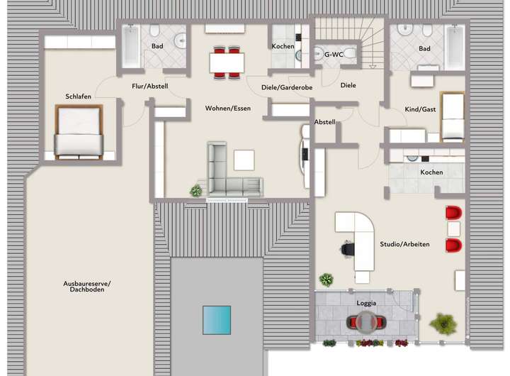 DG: Wohn-/Essbereich mit Kochnische, Schlafzimmer, Bad, Abstellraum, Flur; Studio/Wohnbereich mit Kochnische, Schlafzimmer, Bad, Gäste-WC, Abstellraum, Flur, Loggia; Ausbaureserve