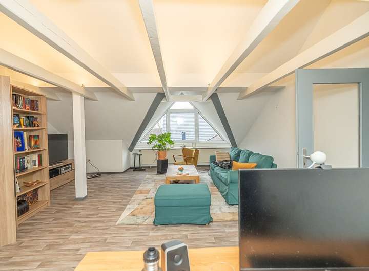 Die vermietete Dachgeschosswohnung verfügt über einen sehr individuellen Grundriss. Diese Wohneinheit wurde gut saniert und renoviert und umfasst zwei Badezimmer, ein nützliches Gäste-WC, einen praktischen Hauswirtschaftsraum, zwei fast 40 m² große Wohnbereich, als Wohnküche und Wohnzimmer genutzte Studiozimmer mit eigenem Balkonbereich. Zudem gibt es praktische Abstellbereiche und zwei kompakte Schlafzimmer.
