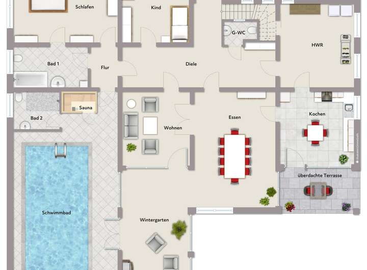 EG: Wohnzimmer, Esszimmer, Wintergarten, 2 Schlafzimmer, Küche, 2 Bäder, Gäste-WC, HWR, Diele; Schwimmbadbereich; überdachte Terrasse