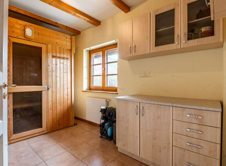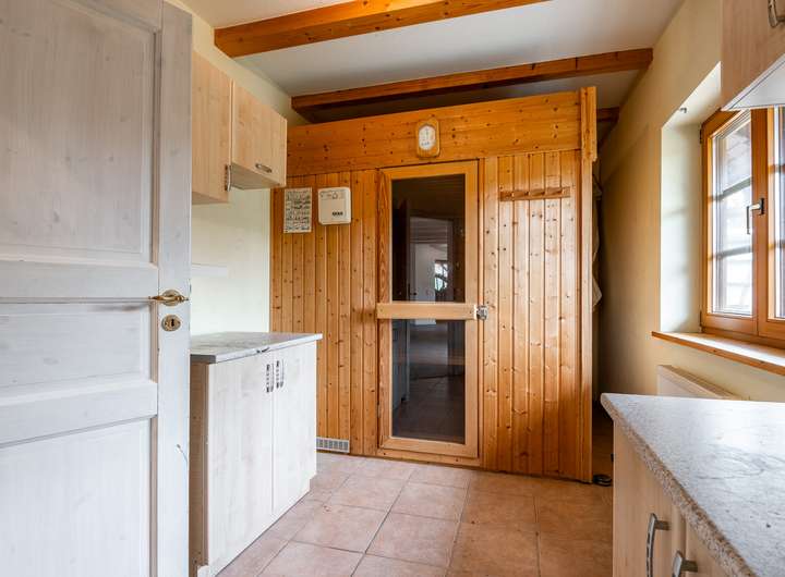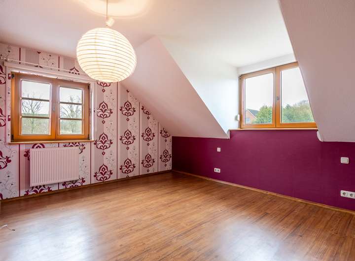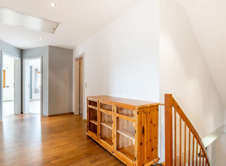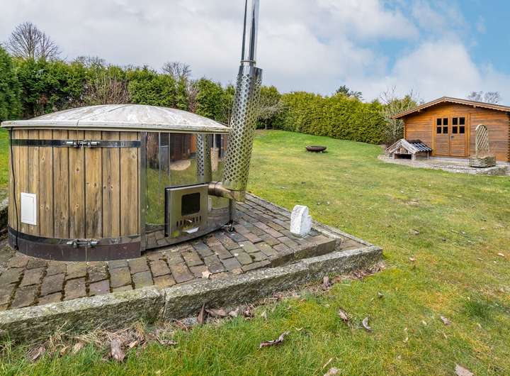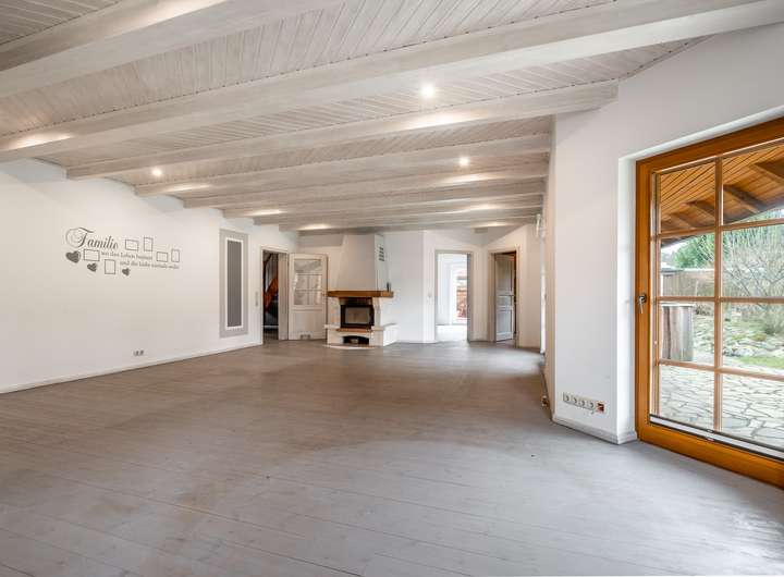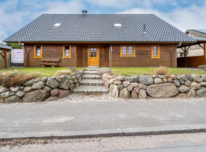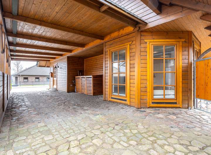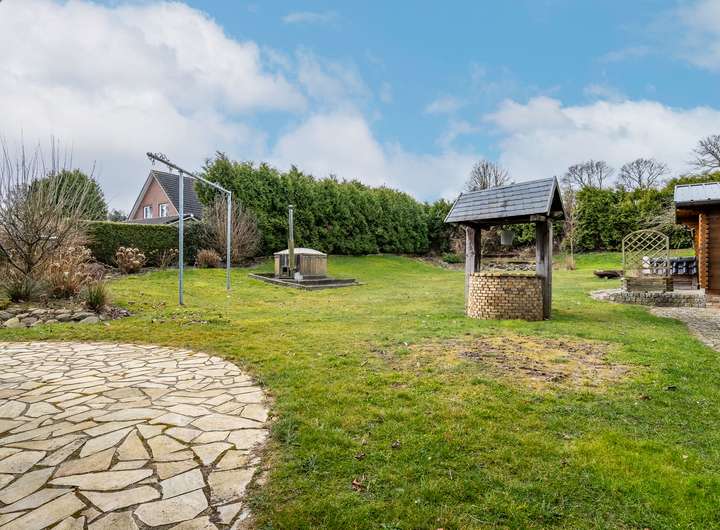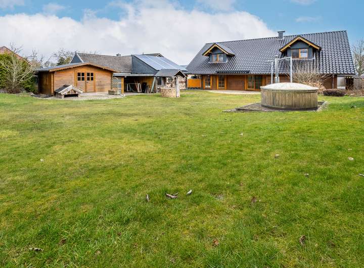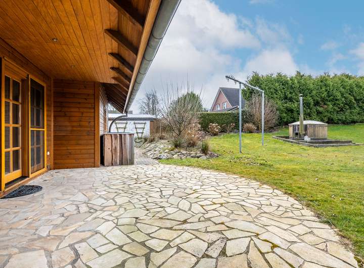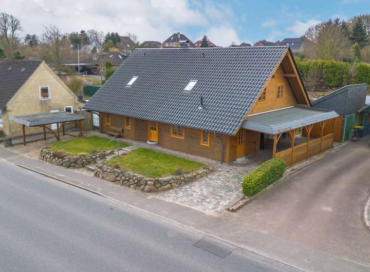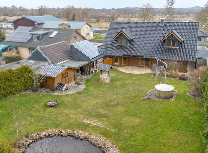 Dieses 2003 in solider Holzbauweise errichtete Einfamilienhaus bietet auf zwei weitläufigen Etagen eine Wohnfläche von 217 m² und einen traumhaft angelegten Garten.Über die Eingangstür betreten sie zunächst den hellen Flur, der viel Platz für eine Garderobe und weitere Aufbewahrungsmöbel bereit hält. Linkerhand liegt ein modernes Gästebad, das zusätzlich über eine große Eckdusche verfügt. Vom Flur rechts abgehend befindet sich die gut ausgestattete Küche im Landhausstil inklusive gemütlicher Essecke. Ein angrenzender Hauswirtschaftsraum, mit praktischem Seiteneingang zum Carport, verfügt über zusätzlichen Stauraum und viel Platz für Waschmaschine und Trockner. Geradeaus gelangen sie zum Herzstück des Hauses, den außergewöhnlich großen Wohnbereich, der mit über 45 m² viel Lebensqualität für die ganze Familie bietet. Durch die zahlreichen bodentiefen Fenster ist der gesamte Bereich herrlich lichtdurchflutet. Der Kamin sorgt für behagliche Stunden am Feuer. Ein weiteres geräumiges Zimmer, welches sich durch einen separaten Eingang optimal als Büro nutzen lässt, sowie eine gemütliche Sauna runden das Platzangebot im Erdgeschoss ab. Über die offene Holztreppe im Flur gelangen sie in das Obergeschoss, wo sie sich zunächst in einem großzügigen Flur befinden, von dem linkerhand ein weiteres Vollbad abgeht. Neben einem Schlafzimmer mit angeschlossenem Ankleidezimmer finden sich auf dieser Etage zwei weitere helle und sehr gut geschnittene Kinderzimmer, sowie ein praktischer Abstellraum. Ein wahres Highlight ist der traumhaft angelegte Garten, der sich ideal als Rückzugsort eignet und viel Raum zur Entspannung bietet. Durch seine Rasenflächen ist er aktuell angenehm pflegeleicht angelegt. Ein holzbefeuerter Hot Tub sorgt für Entspannung - eine hohe Hecke für Sichtschutz und maximale Privatsphäre. Eine große Terrasse lädt zu geselligen Grillabenden ein. Das Gartenhaus und der geräumige Schuppen im Garten bieten zusätzlichen Stauraum, abgerundet von 2 Carports direkt am Haus.