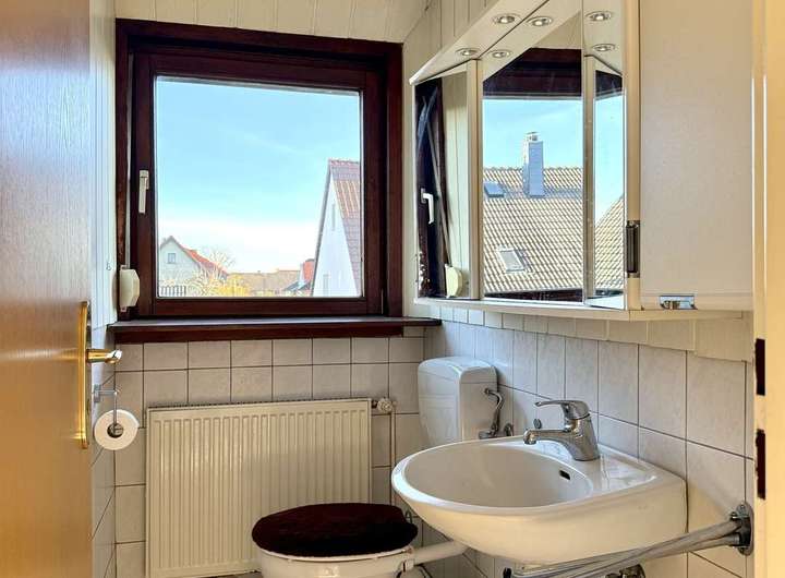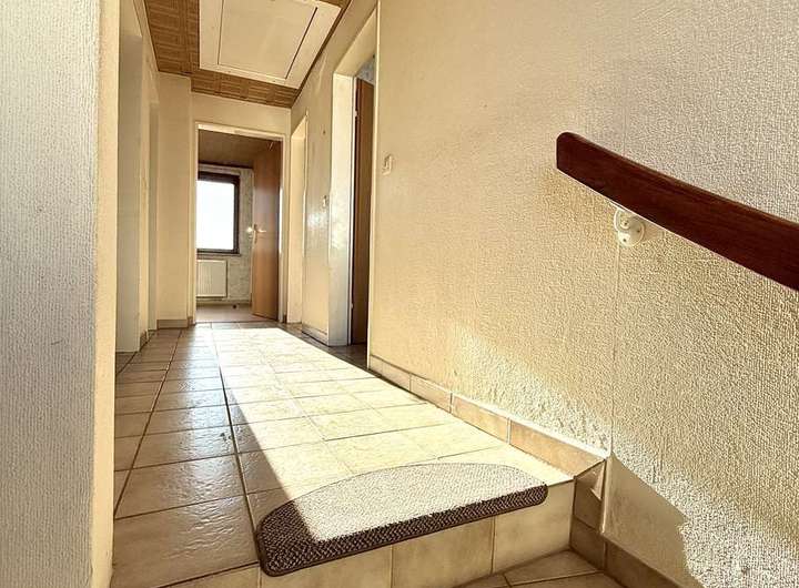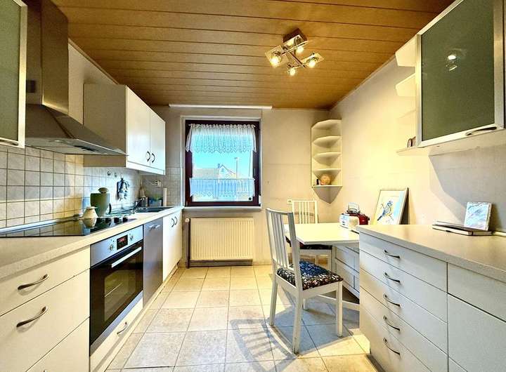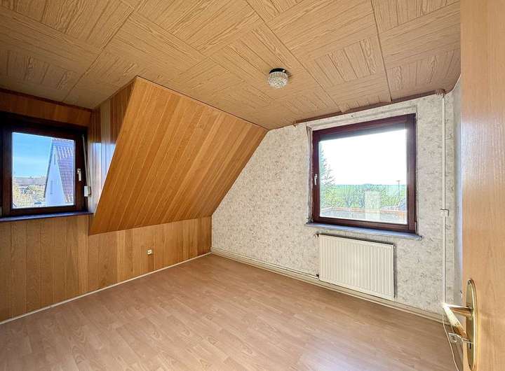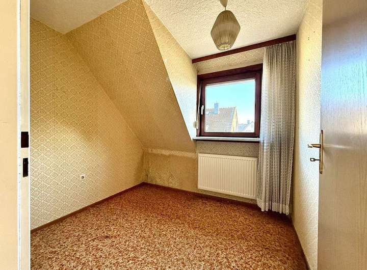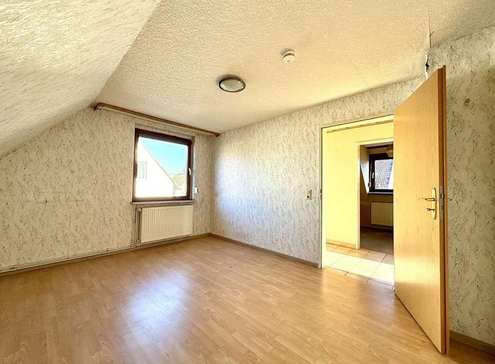 Ca. 104 m² voller Potenzial. Das Erdgeschoss beherbergt ein geräumiges Tageslichtbad mit Dusche/ Wanne, eine abgeschlossene Küche sowie ein großes Wohnzimmer mit Ausgang zur westlich ausgerichteten und teilweise überdachten Terrasse. Im Obergeschoss wurden ein Gäste-WC, ein Schlafzimmer mit Balkon und 3 weitere Zimmer mit variierenden Größen arrangiert. Der Spitzboden bietet noch zusätzliches Ausbaupotenzial oder Stauraum. Der Vollkeller und ein Gartenhaus runden das vielseitige Platzangebot ab. Beheizt wird das Gebäude durch Heizkörper und eine Gaszentralheizung.