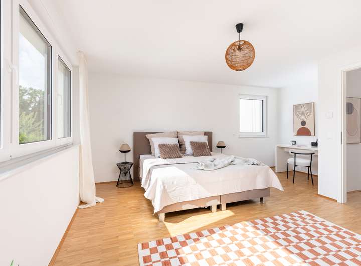 Kunststofffenster mit Isolierverglasung und elektrische Rollläden tragen zur Energieeffizienz und zum Wohnkomfort bei. In allen Wohnbereichen wird massives Eichenparkett als Mosaikparkett verlegt, geflieste Flächen sind entsprechend funktional gestaltet.