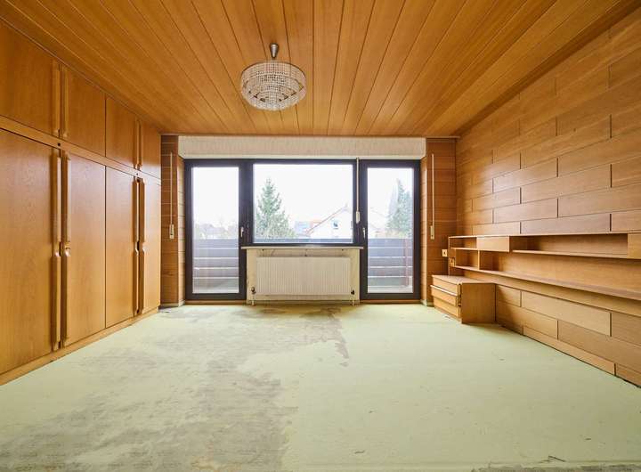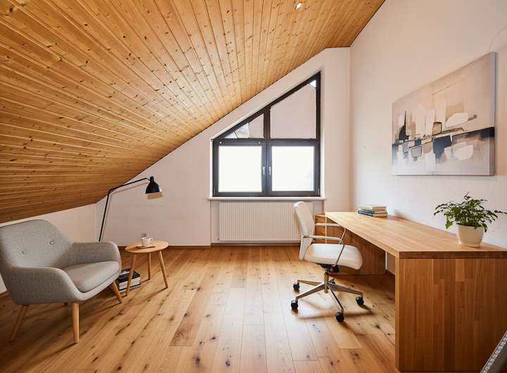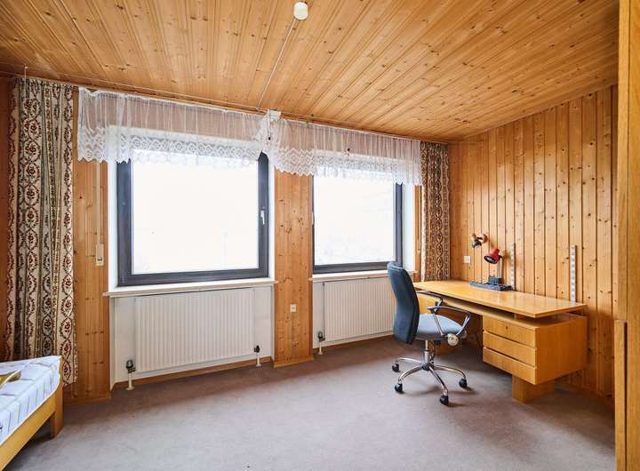 Im Obergeschoss befindet sich der klassische Schlafbereich. Das großzügige Elternschlafzimmer erstreckt sich über die Hausbreite und verfügt über eine große Fensterfront mit Zugang zur überdachten Loggia. Ein weiteres Zimmer, derzeit mit Holzvertäfelung, Einbauten und großen Fenstern ausgestattet, eignet sich hervorragend als Kinderzimmer oder Homeoffice. Das Tageslichtbad im Obergeschoss ist mit Badewanne, Doppelwaschtisch und WC ausgestattet.