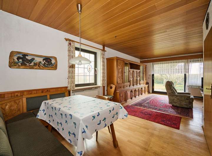 Im Erdgeschoss empfängt ein klassischer Dielenbereich mit Platz für Garderobe und Zugang sowohl zum Wohn-/Essbereich als auch zur Küche und zum Gäste-WC. Der Wohn- und Essbereich ist als länglicher Raum mit großer Fensterfront und Terrassenzugang gestaltet. Eine Eckbank mit Essplatz sowie der Wohnbereich mit Zugang in den Garten schaffen ein gemütliches Umfeld, das sich mit überschaubarem Aufwand modernisieren lässt. Die Holzdecken und der Laminatboden unterstreichen den warmen Charakter des Raumes. Das Gäste-WC verfügt über ein Fenster und ist, wie ein Teil der übrigen Ausstattung, im ursprünglichen Stil erhalten.