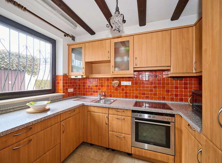 Die Küche ist mit einer gepflegten Einbauküche in U-Form ausgestattet. Helle Holzfronten, eine großzügige Arbeitsfläche und der typisch 70er/80er-Jahre-Fliesenspiegel in warmen Rottönen bilden ein funktionales Ensemble, das sofort nutzbar ist. Das große Fenster sorgt für viel Tageslicht und einen Blick in den Vorgartenbereich, praktische Oberschränke bieten ausreichend Stauraum.