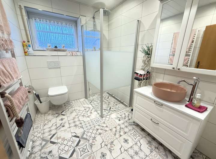 Im Erdgeschoss befinden sich zudem ein Schlafzimmer mit neu verlegtem Vinylboden sowie ein Badezimmer, das im Jahr 2021 grundlegend renoviert wurde. Der Boden wurde erneuert und mit integrierter Fußbodenheizung ausgestattet, die vorhandene Dusche umfassend überarbeitet und mit neuen Duschtrennwänden versehen. Ein Handtuchheizkörper ergänzt die Ausstattung. Ein Hauswirtschaftsraum mit Zugang zur Garage und zum Heizungsraum rundet das Erdgeschoss ab.
