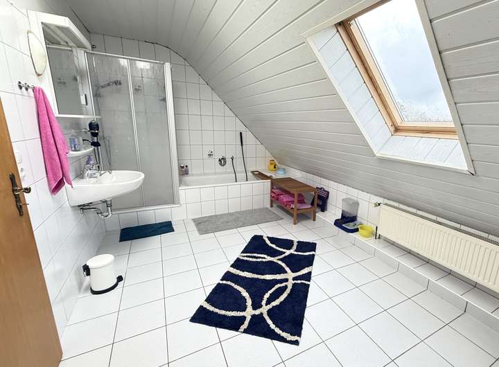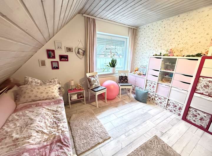 Im Obergeschoss stehen zwei Kinderzimmer, ein weiteres flexibel nutzbares Zimmer (z. B. Gäste- oder Arbeitszimmer), ein großzügiges Badezimmer mit Dusche und Badewanne sowie das Wohnzimmer zur Verfügung. Das Dach ist vollständig isoliert. Der Dachboden ist teilweise ausgebaut, der vorhandene Raum ist aktuell nicht als regulärer Wohnraum nutzbar, da der Zugang über eine Zugtreppe erfolgt. Für eine dauerhafte Nutzung wäre ein vollständiger Ausbau mit fester Treppe erforderlich.