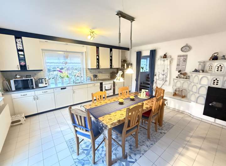 Der zentrale Mittelpunkt des Hauses ist die großzügige Wohnküche mit Platz für einen großen Esstisch. Der Bodenbelag wurde erneuert und mit zeitlosen weißen Fliesen ausgestattet. Die vorhandene Einbauküche ist im Kaufpreis enthalten. Ein eingebauter Kamin sorgt für eine angenehme Wohnatmosphäre. Von hier aus besteht direkter Zugang zur Terrasse und in den Garten.