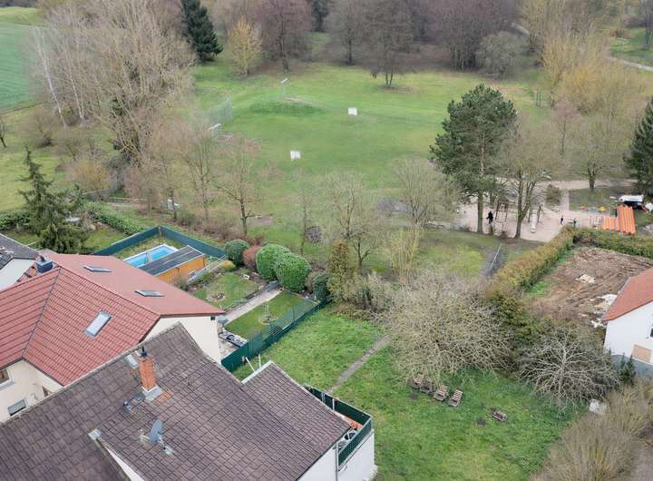 Ein besonderes Highlight ist die direkt angrenzende Grünfläche hinter dem Grundstück. Weitläufige Wiesen und Wege laden zu Spaziergängen, Erholung und Freizeitaktivitäten ein und schaffen ein angenehmes, naturnahes Wohngefühl – fast wie Wohnen im Grünen, kombiniert mit städtischer Nähe.