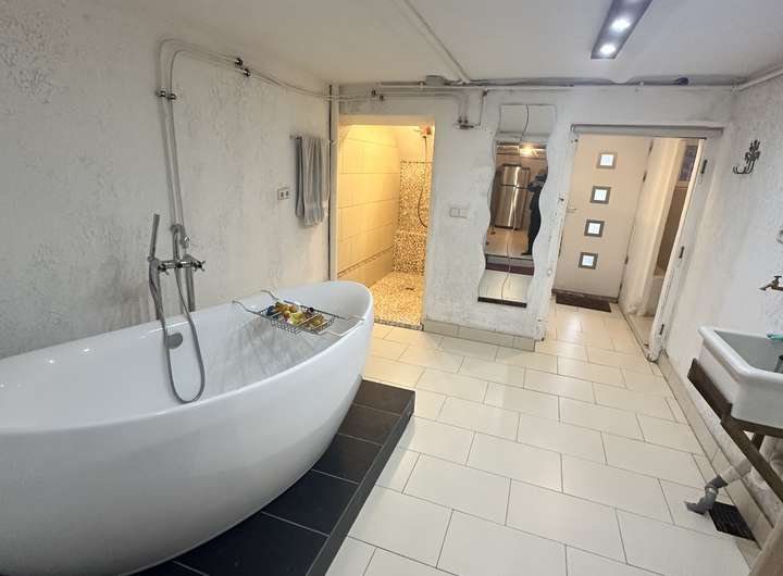 Der Keller ist vom Flur aus zugänglich. Er besteht aus insgesamt vier Räumlichkeiten. Zwei der Räume wurden als Werkstatt genutzt und sind nicht gefliest und nicht saniert. Der Rest des Kellers ist saniert und gefliest. In einem großen Raum befindet sich ein zweites Bad mit großer, freistehender Badewanne und großzügiger Walk-In-Shower. Hier befinden sich ebenfalls die Anschlüsse für eine Waschmaschine und einen Trockner.