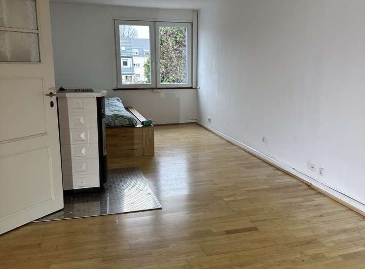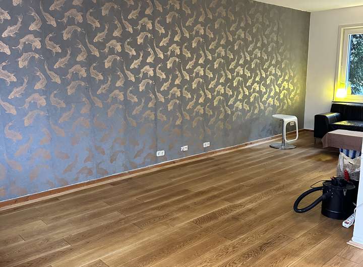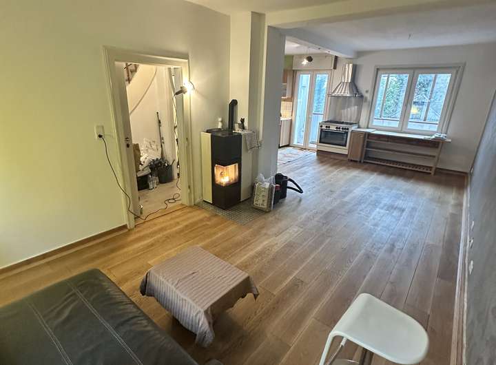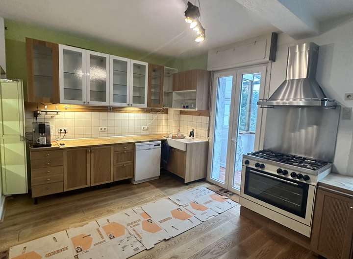 Ein gefliester Flur führt in eine ca. 40 qm große Wohnküche. Der Boden dieses Raumes besteht aus 20mm Massivdielen Eiche, geölt. Der Boden wurde im August 2025 frisch abgeschliffenen und neu geölt, ist somit neuwertig. Von der Wohnküche aus gelangt man durch eine große Balkontür auf einen verglasten Wintergarten mit ca. 9 qm. Von diesem aus führt eine kurze Treppe in den hinteren Garten.