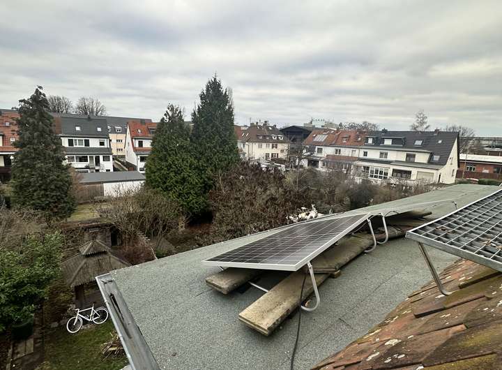 Auf dem Gaubendach zum hinteren Garten befinden sich zwei Solarpanelle, als sog. „Balkonkraftwerk“. Registriert und genehmigt am 03.10.21 mit 0,6 kW