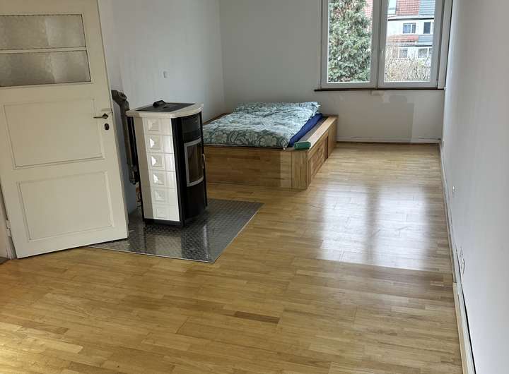Im 1. OG befindet sich ein Bad mit Dusche, ein separates WC und ein ca. 30 qm großer Raum mit Buchenholz-Laminat.