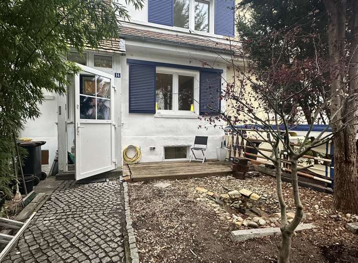 Der hintere Teil des Kellers besteht auch einem kleineren Tageslicht-Raum (mit 2 Fenstern) mit einer Neben-Eingangstür die ebenerdig in den hinteren Garten führt. Dieser hintere Raum wurden u.a. als Fahrradkeller genutzt.