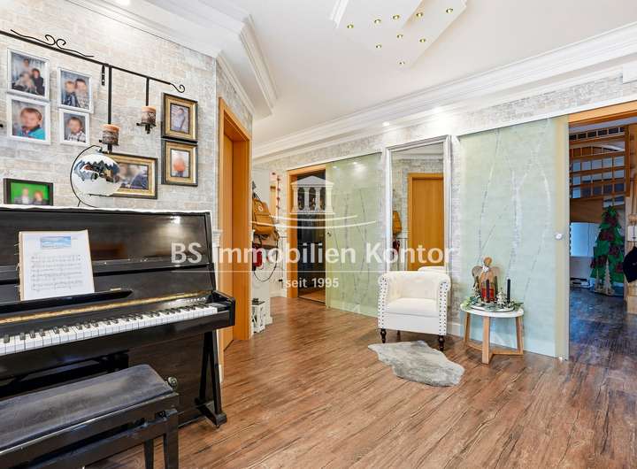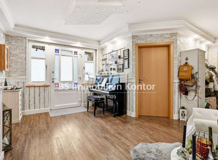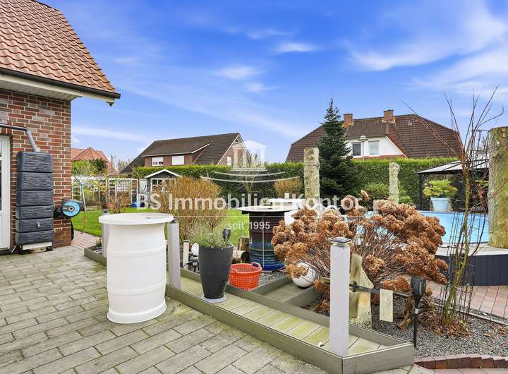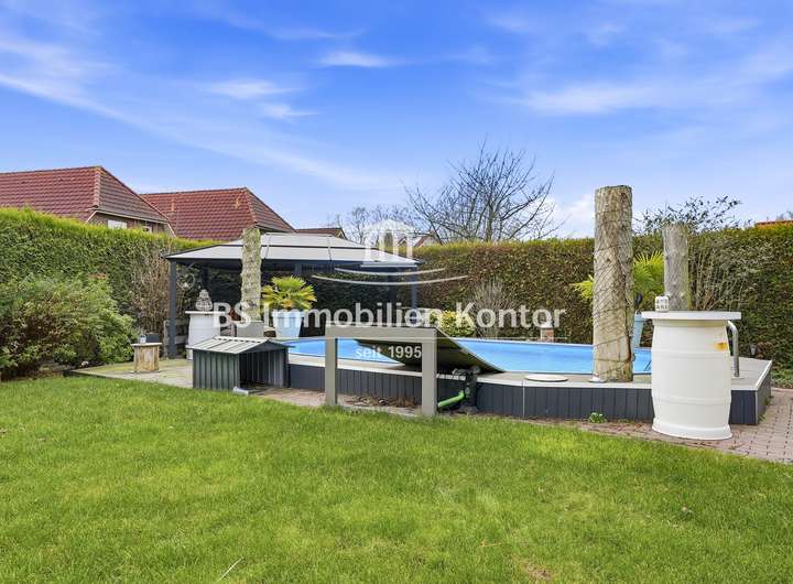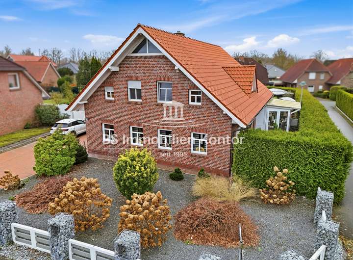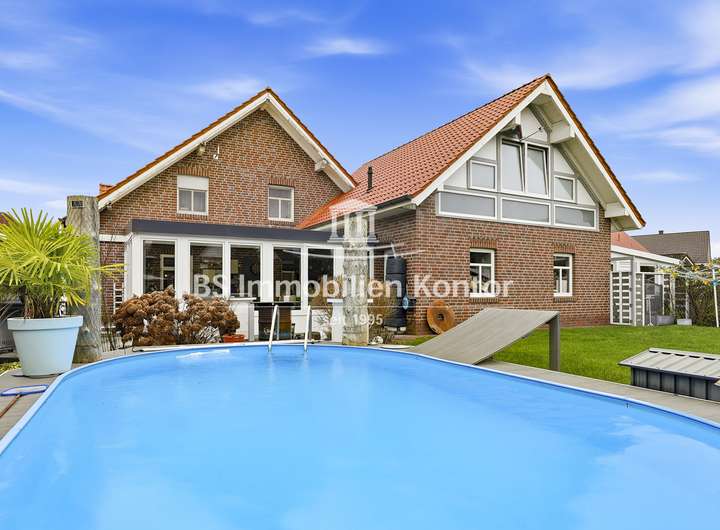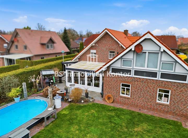 Sie suchen ein neues, großzügiges zu Hause in Ihrhove? Dann sind Sie hier richtig! Dieses attraktive Immobilienangebot befindet sich in einer ruhigen Siedlungslage zwischen Papenburg & Leer und überzeugt mit einem durchdachten Wohnkonzept sowie zahlreichen Highlights. Die im Jahr 2001 in solider Massivbauweise mit einem Satteldach errichtete Immobilie wurde mit viel Liebe zum Detail gebaut. Der Garten bietet Ihnen einen großen Swimmingpool, einen Grillplatz sowie eine großzügige Terrasse – ideal zum Entspannen und Genießen. Helle, lichtdurchflutete Räume und eine offene Wohnkultur unterstreichen den besonderen Charme dieser Immobilie. Die stilvolle Einbauküche mit angrenzenden Essbereich schafft den idealen Rahmen für genussvolle Kochabende mit Familie und Freunde. Die weißen Kunststofffenster sind Isolierverglast und mit Jalousien ausgestattet. Das Grundstück bietet Ihnen mit 986qm ausreichend Platz & Privatsphäre. Für ein angenehmes Raumklima sorgt die Fußbodenheizung, die im Erdgeschoss vollständig sowie im Obergeschoss im Badezimmer vorhanden ist. Insgesamt präsentiert sich diese Immobilie als ein durchdacht modernisiertes Zuhause, das Komfort, Funktionalität und Lebensqualität auf gelungene Weise miteinander verbindet.
