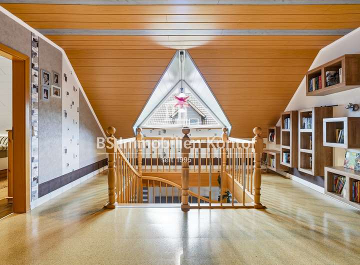 OG:Flur/Diele, Galerie, Elternschlafzimmer, 2x Kinderzimmer, Bad, Saunazimmer sowie Großes Zimmer mit Loggia oberhalb der Garage