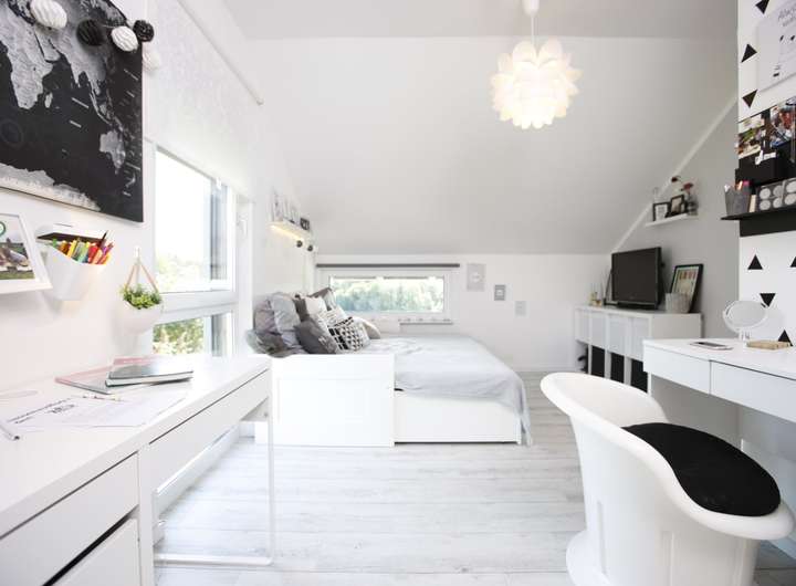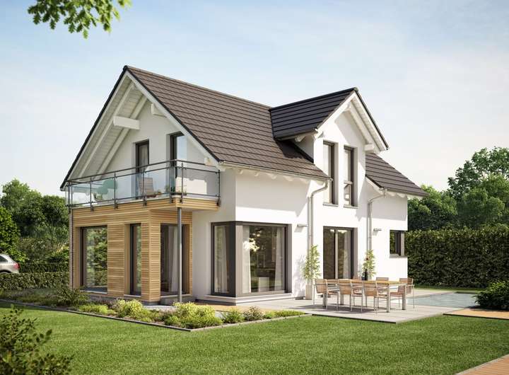 Dieses moderne Fertighaus bietet jungen Familien mit bis zu zwei Kindern ein durchdachtes Zuhause zum Wohlfühlen. Die klare Architektur mit weißem Mineralputz, Erker, Balkon und großen Glasflächen fügt sich harmonisch in jedes Baugebiet ein. Im Erdgeschoss überzeugt der offene Wohn-, Ess- und Kochbereich, während praktische Räume wie Technikraum, Garderobe und Gäste-WC kurze Wege ermöglichen. Das Dachgeschoss bietet zwei gleich große Kinderzimmer, ein Elternschlafzimmer mit Ankleide sowie ein komfortables Wellnessbad. So entsteht ein familienfreundliches Wohnkonzept mit viel Licht, Funktionalität und Raum für gemeinsame Zeit.