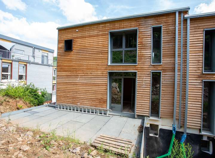 Die Terrasse im Garten wird noch gepflastert, ebenso wie die Einfahrt. Im Garten wird noch Erde aufgeschüttet und Rollrasen verlegt. Die Dachterrasse wird noch mit Holz oder Steinplatten und einem Geländer ausgestattet!