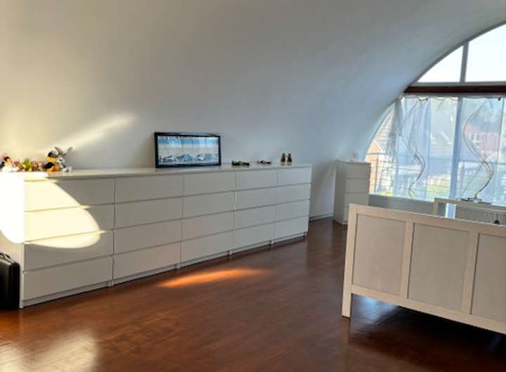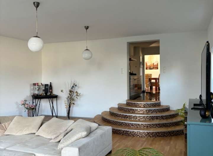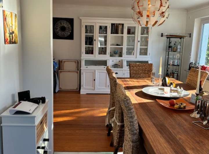 Das edle Echtholzparkett verleiht dem Raum Wärme und Eleganz, während die klare Architektur für ein modernes und zugleich wohnliches Ambiente sorgt. Eine stilvolle Deckengestaltung mit hochwertigen Leuchten setzt zusätzlich Akzente und unterstreicht den anspruchsvollen Charakter des Hauses.