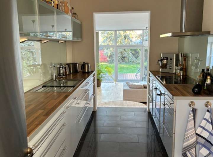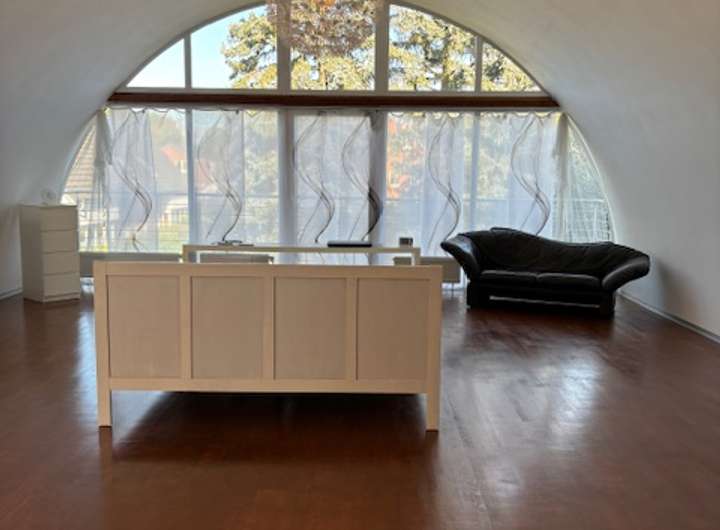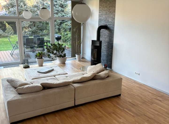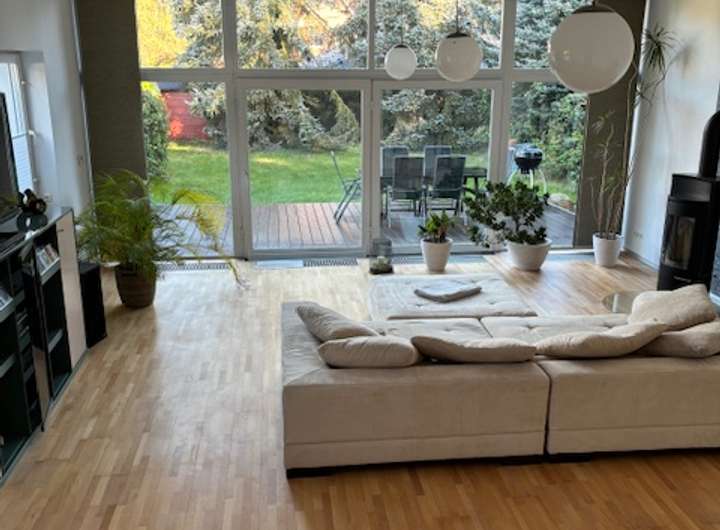 Der zentrale Wohnbereich des Hauses beeindruckt mit einer außergewöhnlichen Raumwirkung: Große, bodentiefe Fensterfronten lassen den gesamten Raum in natürlichem Licht erstrahlen und schaffen eine fließende Verbindung zwischen Innen und Außen. Der Blick öffnet sich unmittelbar auf die großzügige Terrasse und den liebevoll angelegten Garten – ein idealer Ort für ruhige Abendstunden oder gesellige Runden im Freien.