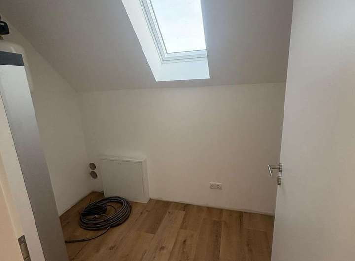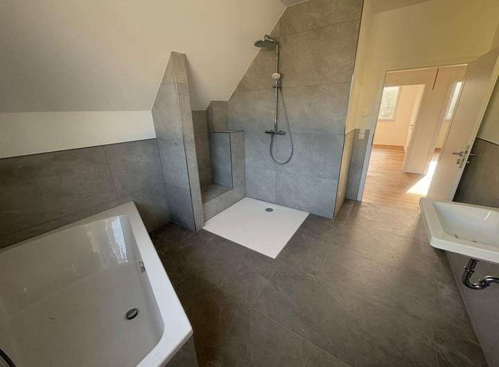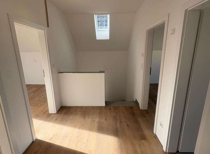 Über die massive Treppe erreicht man das Obergeschoss. Auf halber Höhe befindet sich der Zugang zum Dachboden, der sich hervorragend als zusätzlicher Stauraum nutzen lässt. Im Obergeschoss erwartet Sie ein komfortables Tageslichtbad mit Dusche, Badewanne, WC und Waschbecken. Gegenüber liegen drei weitere Zimmer, die flexibel als Schlaf-, Kinder-, Gäste- oder Arbeitszimmer gestaltet werden können. Ein zusätzlicher Raum dient als Abstellfläche und beherbergt eine weitere Heizungsanlage, wodurch das Haus auch technisch optimal ausgestattet ist.