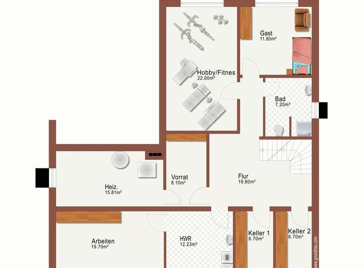 Im Untergeschoss finden Sie ein geräumiges wohnlich ausgebautes Gästezimmer, ein Hobby- oder Fitnessraum und ein mögliches Arbeitszimmer. Alle Räume sind beheizt und mit Tageslicht ausgestattet. Ein weiteres Duschbad, Hauswirtschaftsraum und verschiedene Abstellkeller befinden sich ebenfalls auf dieser Ebene. Vom Hauswirtschaftsraum aus führt eine Außentreppe in den Gartenbereich.