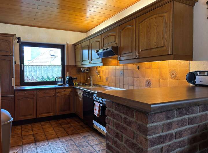 Über den Flur gelangen Sie in die funktionale Küche mit eigenem Vorratsraum – hier sind kurze Wege garantiert. Die Küche ist zum Essbereich hin offen gestaltet.
