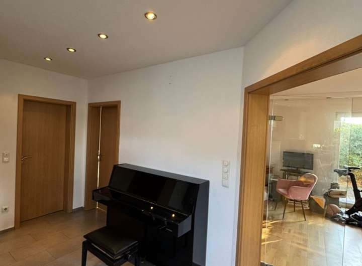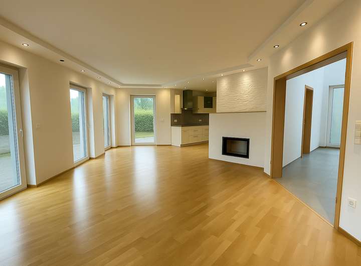 Das Wohnzimmer ist mit einem Parkettboden ausgestattet, während die restlichen Bereiche gefliest sind. Nahezu im gesamten Haus sind die Fenster bodentief gestaltet und mit elektrischen Rollläden versehen.