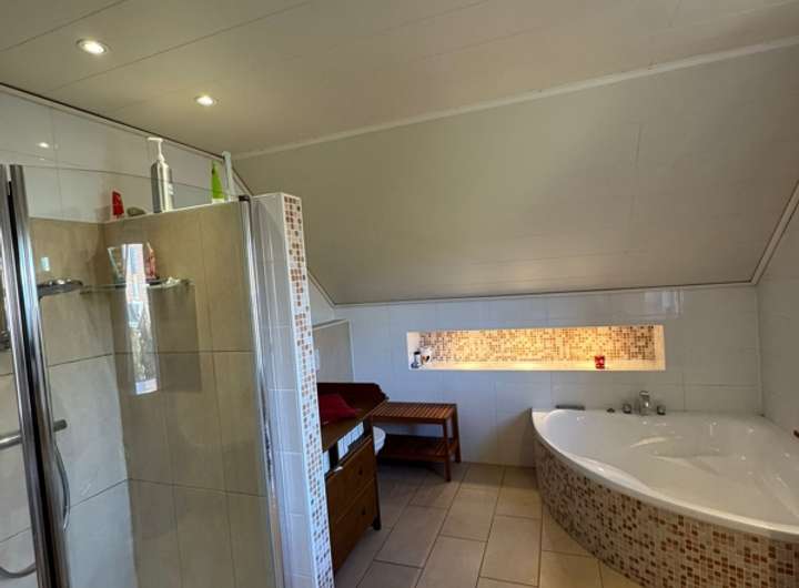 Das Haus besticht durch ein ausgebautes Satteldach und bodentiefe Fensterelementen, die mit elektrischen Rollläden ausgestattet sind. Eine Gaszentralheizung sorgt zusammen mit der Fußbodenerwärmung im gesamten Haus für angenehme Wärme. Ein Kamin im Wohnbereich trägt zusätzlich zur gemütlichen Atmosphäre bei.