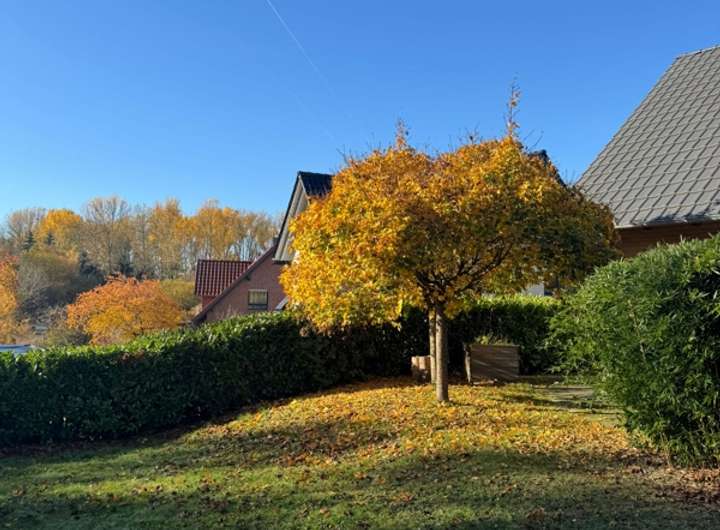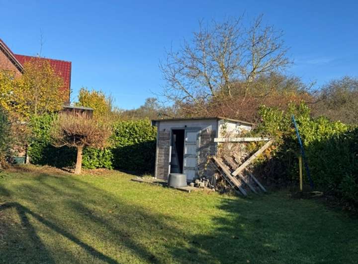 Das bereits angewachsene Grundstück schützt vor neugierigen Blicken und ein Gartenhäuschen bietet Platz für Gartenmöbel und Geräte.