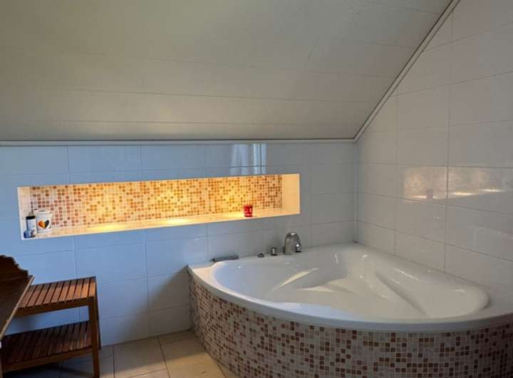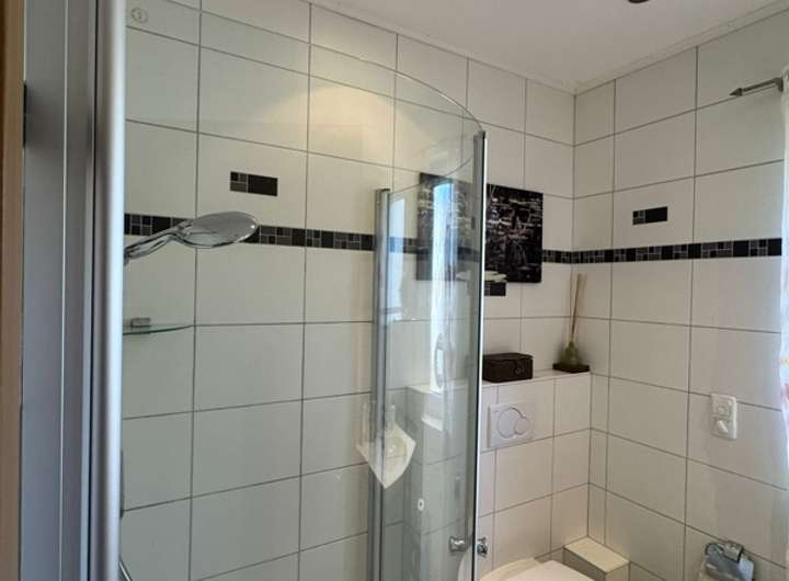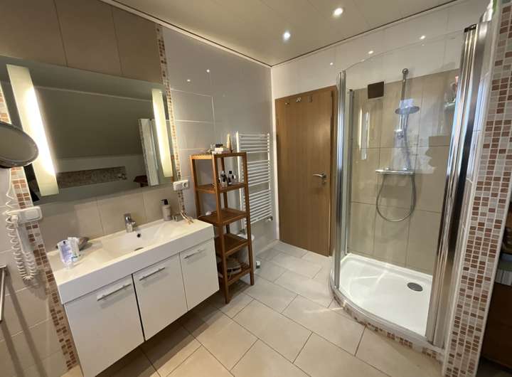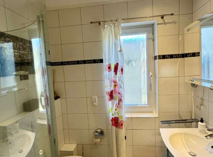 Das moderne Tageslichtbad verfügt über eine Eckbadewanne, Dusche, und einen Waschtisch. Ein Abstellraum, der sich direkt neben einem der Schlafzimmer befindet, bietet Platz für diverse Gegenstände oder könnte als Ankleideraum genutzt werden.