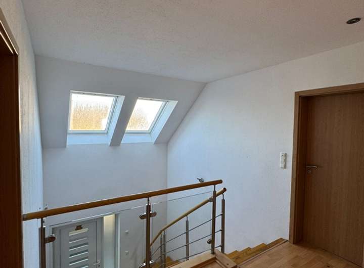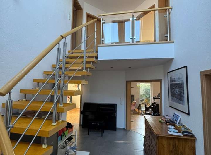 Über eine Stahltreppe mit Holzstufen erreichen Sie das Obergeschoss, wo Sie eine helle Galerie mit Blick in den Eingangsbereich des Erdgeschosses empfängt. Von der Galerie gelangen Sie in die drei geräumigen Schlafzimmer, die mit Laminat ausgelegt sind.