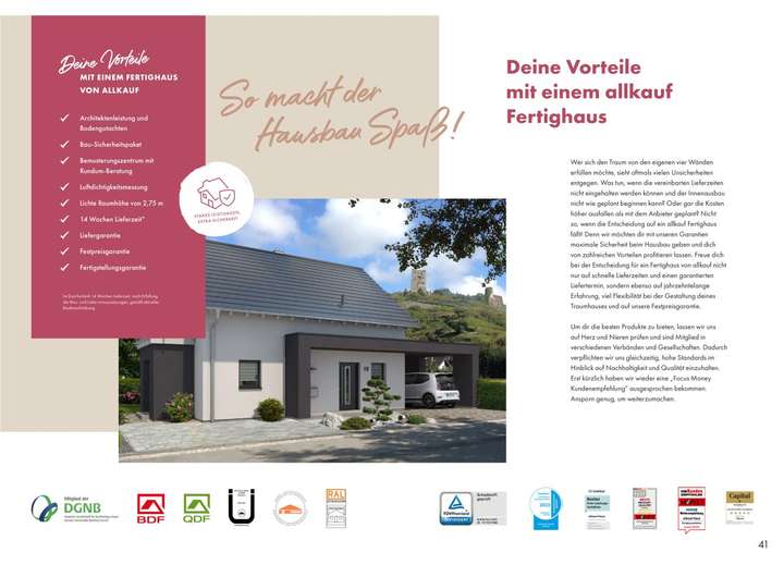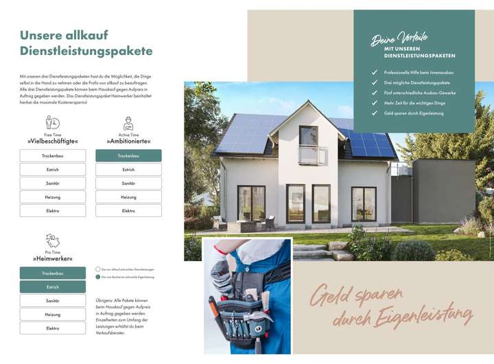 Das Besondere an diesem Projekt ist das Konzept der Ausbauhäuser von allkauf. Je nach Ihren Wünschen können Sie entscheiden, ob Sie den Innenausbau selbst gestalten oder professionelle Unterstützung in Anspruch nehmen möchten. Unsere Dienstleistungspakete - VIELBESCHÄFTIGTE, AMBITIONIERTE und HEIMWERKER - bieten Ihnen die Flexibilität genau nach Ihren Bedürfnissen zu handeln. So können Sie entweder selbst Hand anlegen oder auf unsere erfahrenen Profis zurückgreifen. Jedes Paket ist darauf ausgelegt, Ihnen maximale Sicherheit zu bieten - inklusive Festpreisgarantie und kurzen Lieferzeiten. Jetzt ist der ideale Zeitpunkt, um Ihr individuelles Einfamilienhaus in Wattenheim zu planen!
