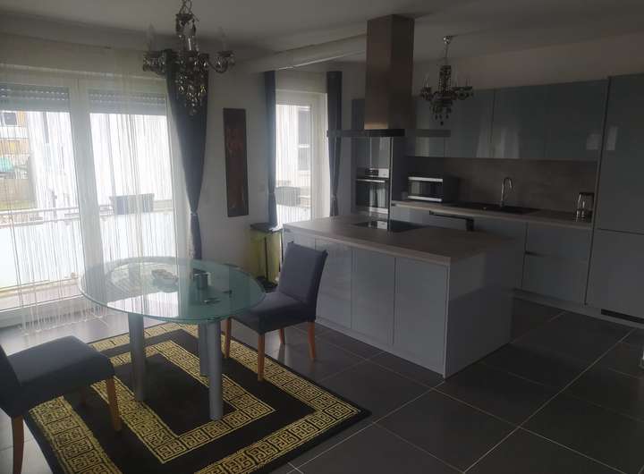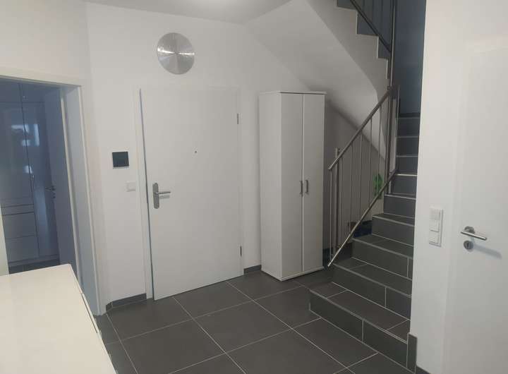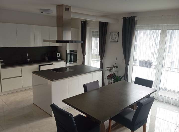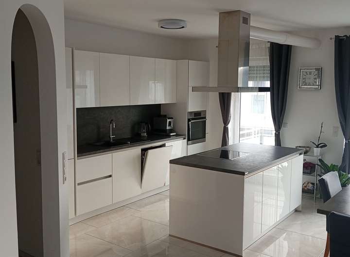 Anthrazit-Fliesen 60×60, Hochglanz-Einbauküche von Nolte, Bad mit Wanne + Dusche, zusätzliches WC.