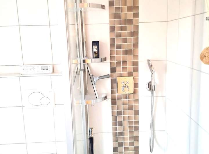 Badezimmer punktet mit einer bodentiefen Dusche sowie modernem Sanitärdesign und