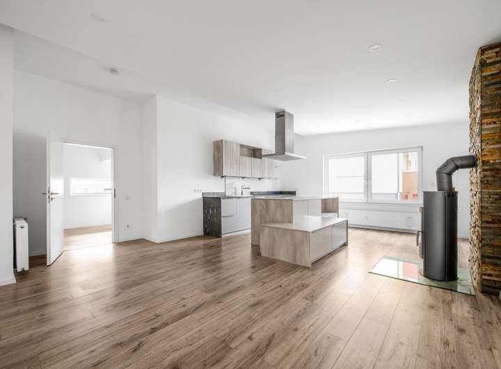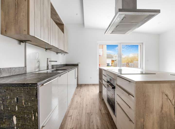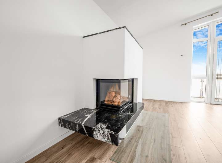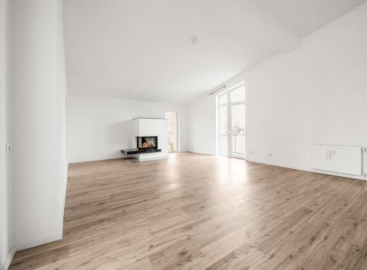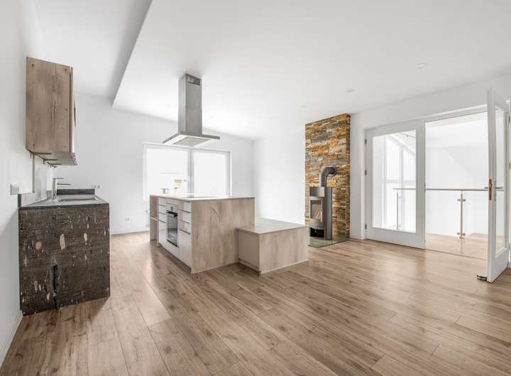 Die Wohnräume wurden mit hochwertigem Vinylboden ausgestattet, während Küche und Badezimmer mit pflegeleichten Fliesen überzeugen. Das eindrucksvolle Masterbad bildet das Highlight des Hauses: eine freistehende Badewanne als Mittelpunkt des Raumes, ergänzt durch eine großzügige, begehbare Dusche – ein Wohlfühlbereich mit exklusivem Charakter. Die Küche bietet neben einer modernen Einbauküche auch einen Kamin sowie Platz für einen großen Esstisch. Ein weiterer Kamin im Wohnzimmer schafft eine warme, gemütliche Atmosphäre.
