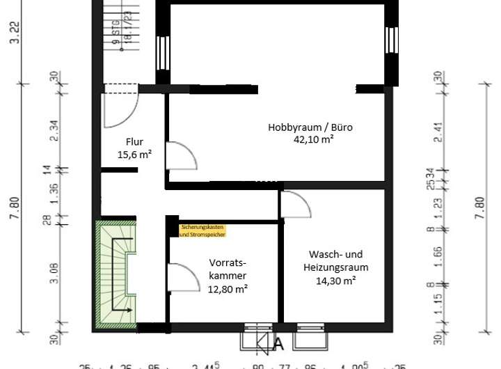 Kellergeschoss: Ein 42 qm großer Hobbyraum, 2 weitere Kellerräume wie Waschküche und Abstellraum.