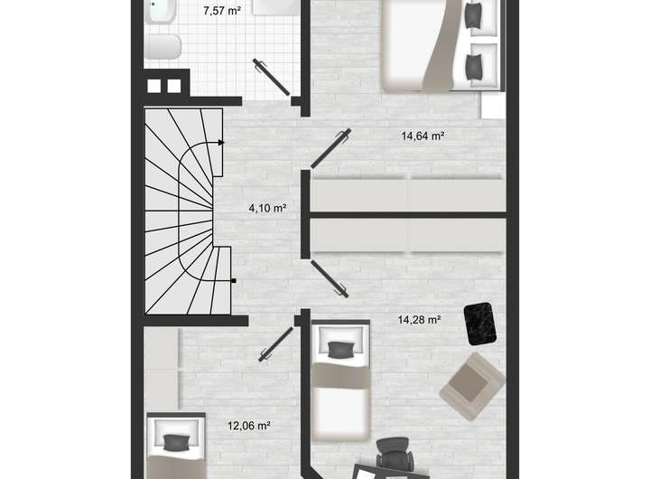 In der ersten Etage befinden sich drei gut geschnittene Schlafzimmer sowie ein modernes Badezimmer mit Dusche, Badewanne und Fenster. Zwei der Schlafzimmer bieten direkten Zugang zu einem Balkon – perfekt, um den Tag mit frischer Luft zu beginnen.