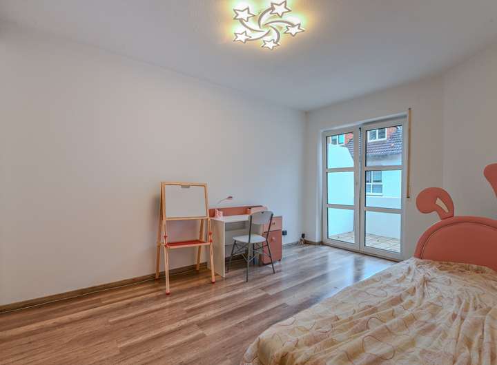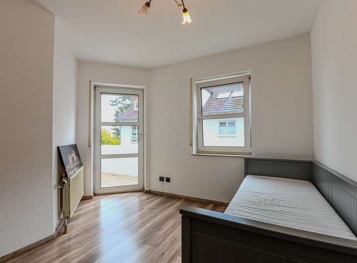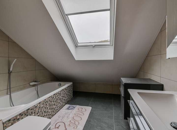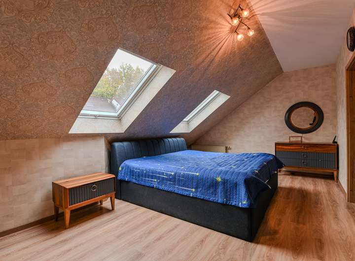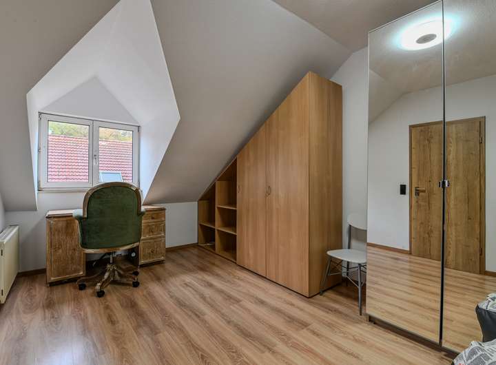 Das Dachgeschoss beherbergt ein weiteres, sehr großzügiges Schlafzimmer sowie ein eigenes Badezimmer. Dieser Bereich eignet sich ideal als Elternsuite, Gästeetage oder privater Rückzugsort.