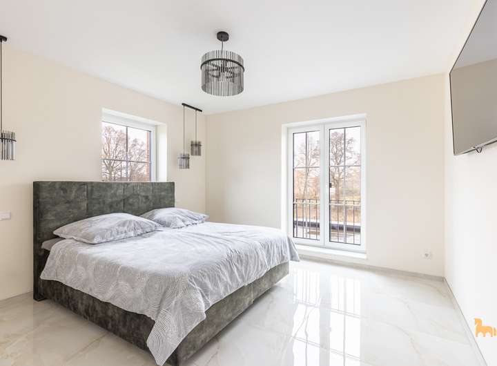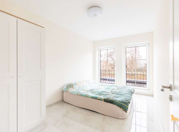 Die Immobilie wird über eine moderne Luft-Wärmepumpe beheizt und verfügt über dreifach verglaste, bodentiefe Fenster, die für ein außergewöhnlich helles und offenes Wohnambiente sorgen. Zwei Vollgeschosse ohne Dachschrägen bieten großzügige, lichtdurchflutete Räume und optimale Nutzungsmöglichkeiten.