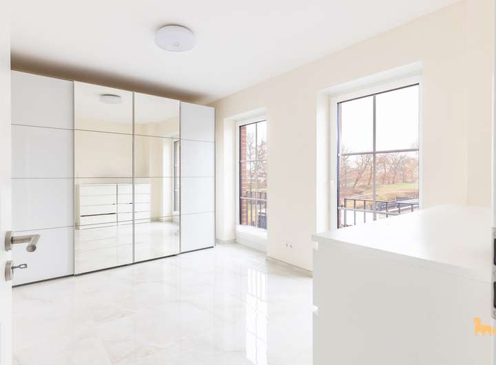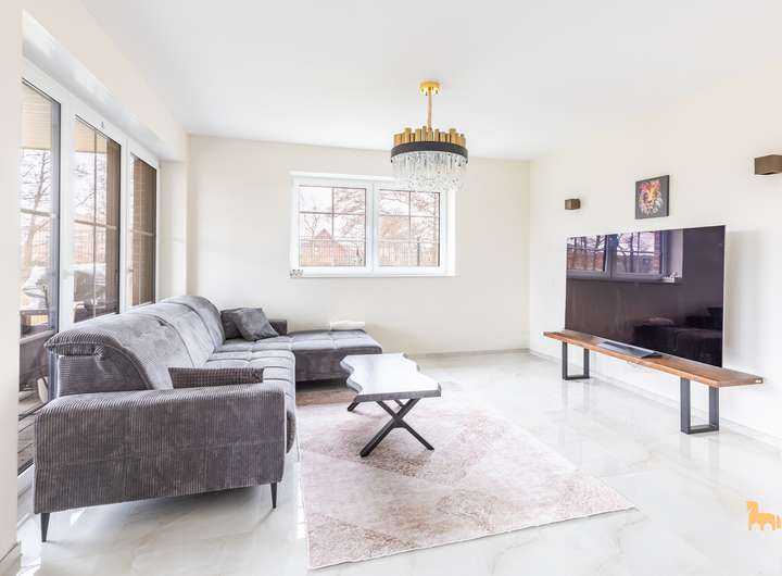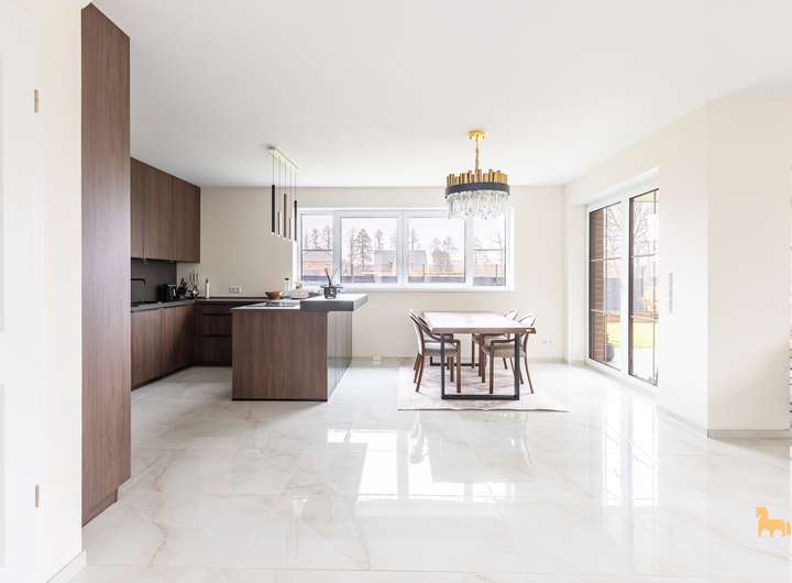 Der Wohn- und Essbereich besticht durch seine Größe, hochwertige Bodenbeläge und den direkten Zugang zur Terrasse – sowohl vom Wohnzimmer als auch von der exklusiven Einbauküche aus. Diese ist neu, sehr hochwertig ausgestattet und verfügt über moderne Arbeitsplatten sowie erstklassige Elektrogeräte.
