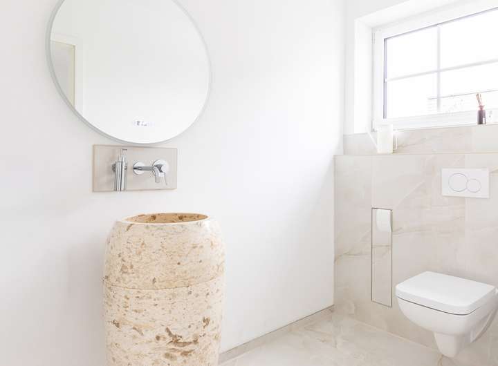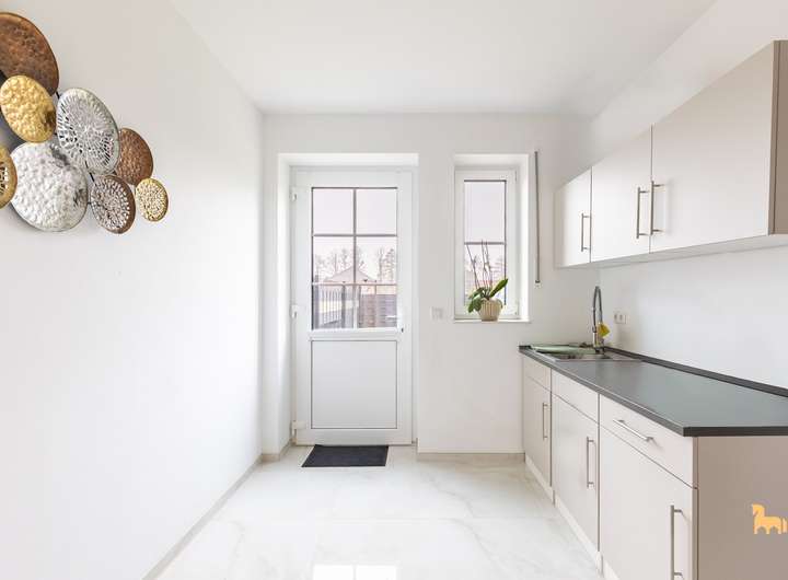 Ein elegantes Gäste-WC mit exklusiver Ausstattung, ein stilvolles Hauptbad in harmonischen Farben sowie ein Hauswirtschaftsraum mit zusätzlicher Küchenzeile runden das Raumangebot ab. Von hier aus ist ebenfalls der Zugang zum Garten möglich.