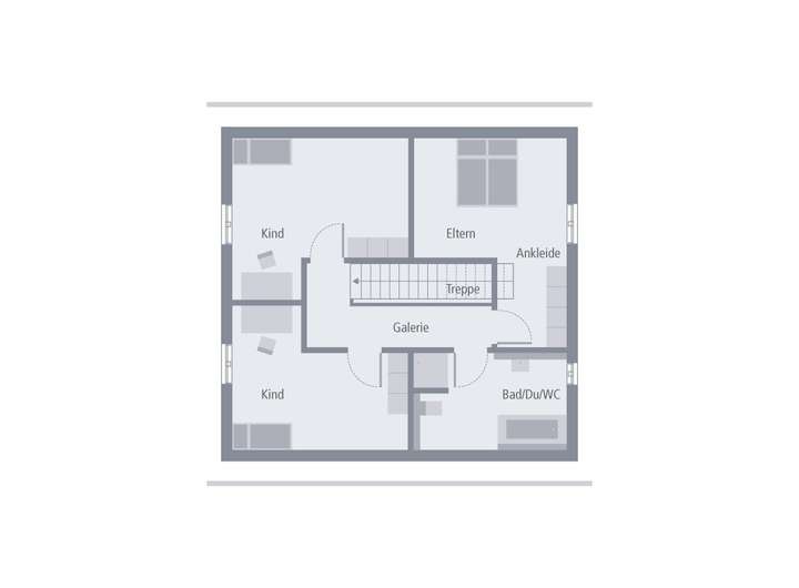 Über die mittig angeordnete Treppe gelangt man ins Obergeschoss. Hier bietet das Haus viel Platz für Eltern und bis zu zwei Kinder: