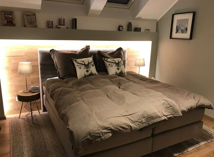 Ein großzügiges Elternschlafzimmer mit separater Ankleide, zwei helle Kinderzimmer sowie ein großes Badezimmer mit Dusche, Badewanne und WC runden das stimmige Raumkonzept ab.