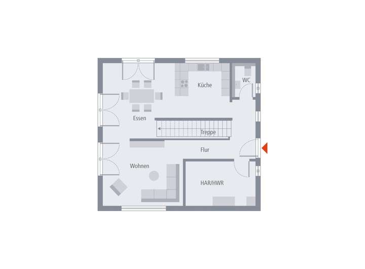 Im Erdgeschoss steht Offenheit im Mittelpunkt: Der großzügige Wohn-, Ess- und Kochbereich erstreckt sich nahezu über die gesamte Ebene und wird lediglich durch die zentral platzierte Treppe von der Diele abgetrennt. So entsteht ein lichtdurchfluteter, einladender Wohnraum, der zum Wohlfühlen und Zusammensein einlädt.