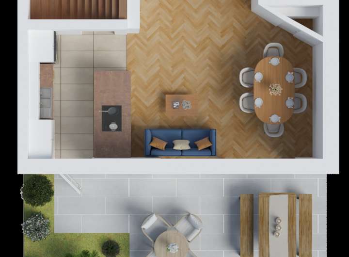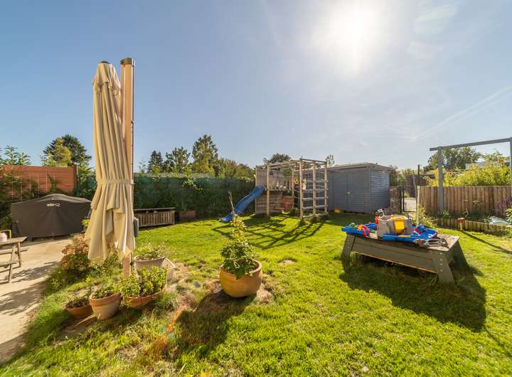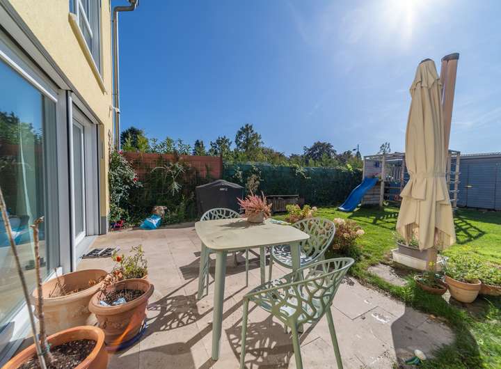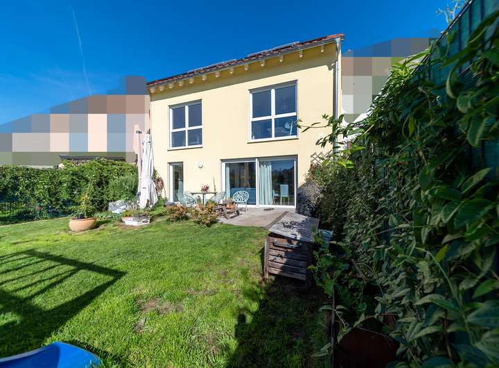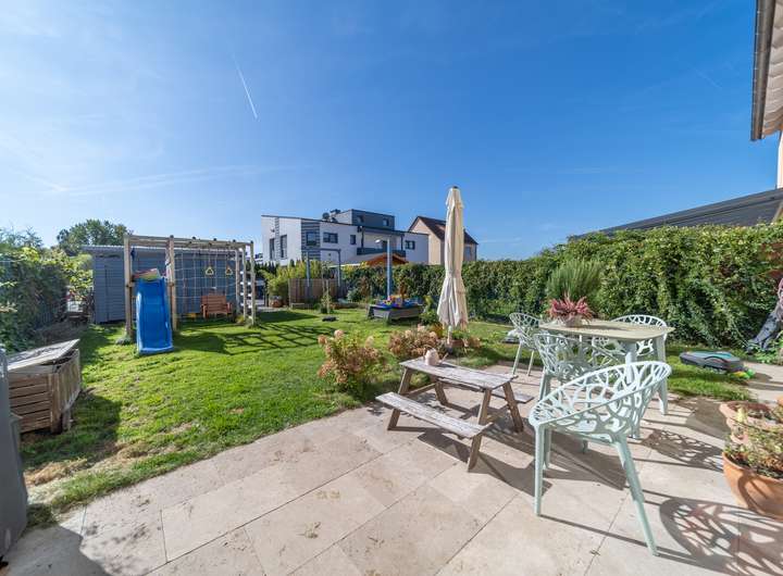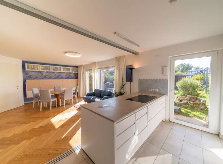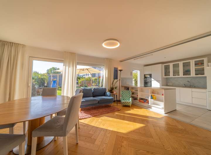 Sie betreten das Haus durch die elektrisch öffnende Haustür mit Fernbedienung. Im Erdgeschoss empfängt Sie ein großzügiger Eingangsbereich mit Gäste-WC und Haustechnikraum. Von hier führt der Weg in den offenen Wohn- und Essbereich, der mit Echtholz-Fischgrätparkett ausgestattet ist. Die offene Küche bietet eine praktische Abstellnische. Über die große Fensterfront des Wohnzimmers gelangt man direkt auf die Terrasse und in den Garten. Dieser ist nach Südosten ausgerichtet, bietet viel Platz für Spielen, Entspannen oder gesellige Runden und verfügt über zwei Gartenschuppen sowie ein Gartentor auf der Rückseite. Ein weiteres Zimmer im Erdgeschoss, aktuell als Musik- und Fernsehzimmer genutzt, lässt sich durch eine Schiebetür bei Bedarf vom Wohnraum trennen.