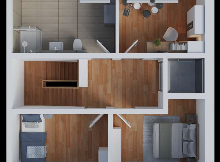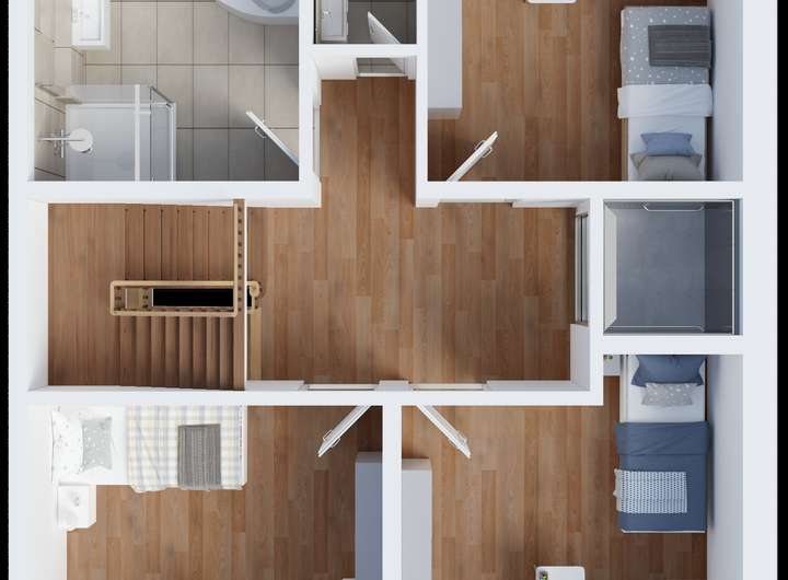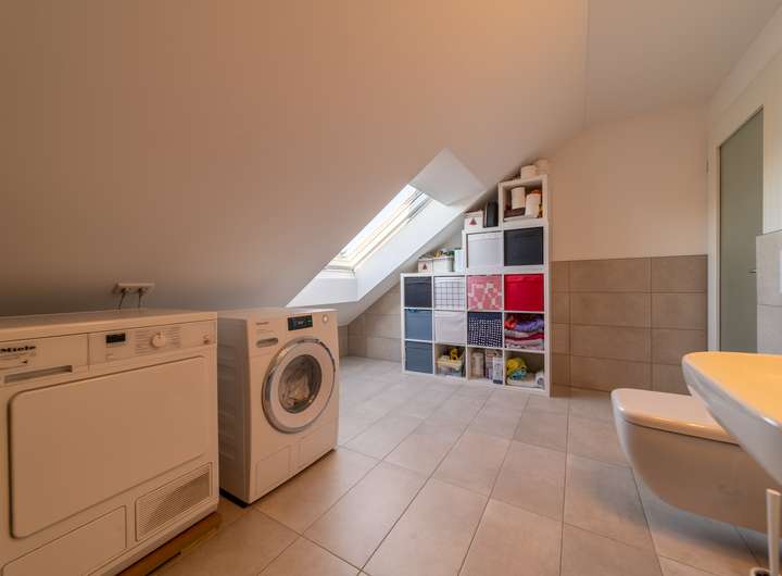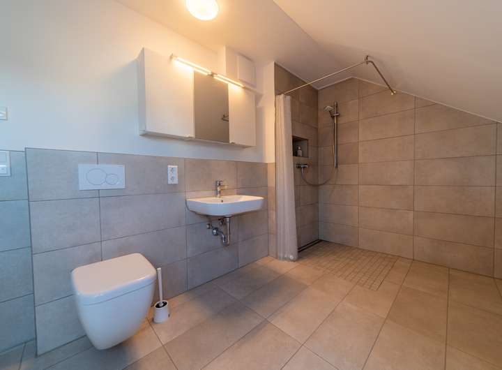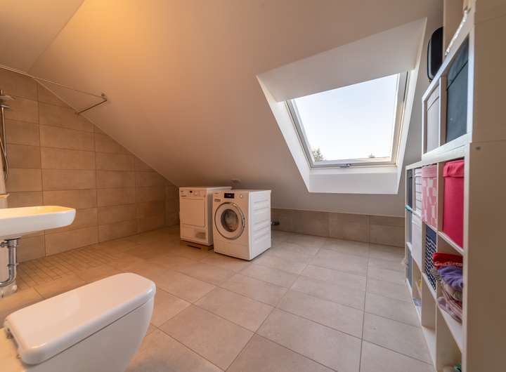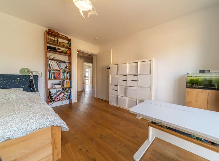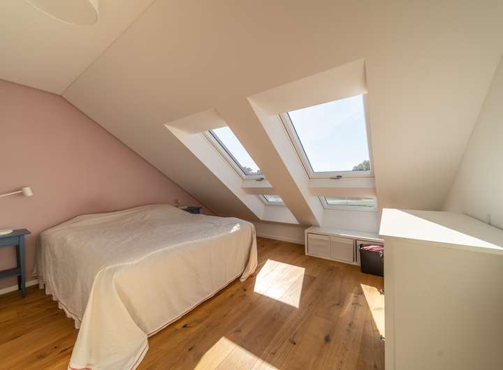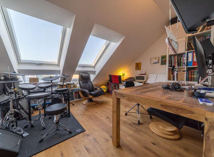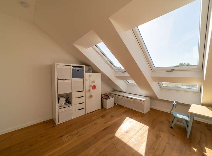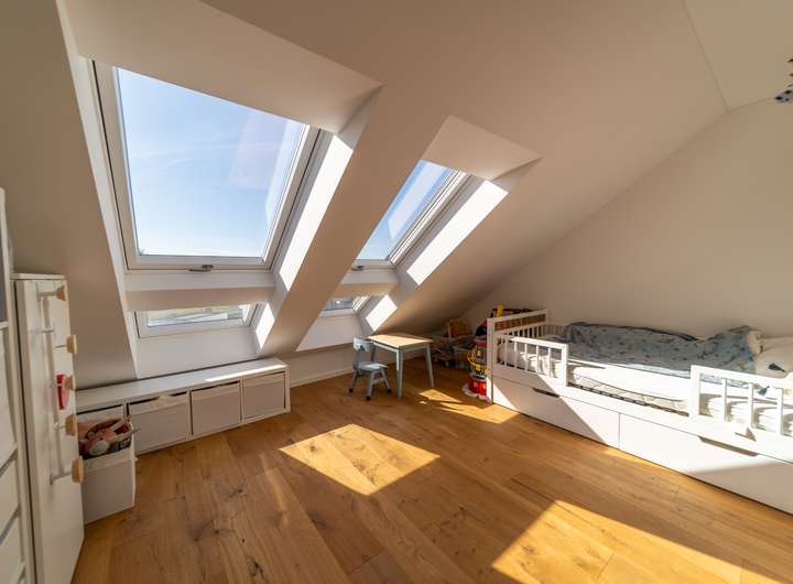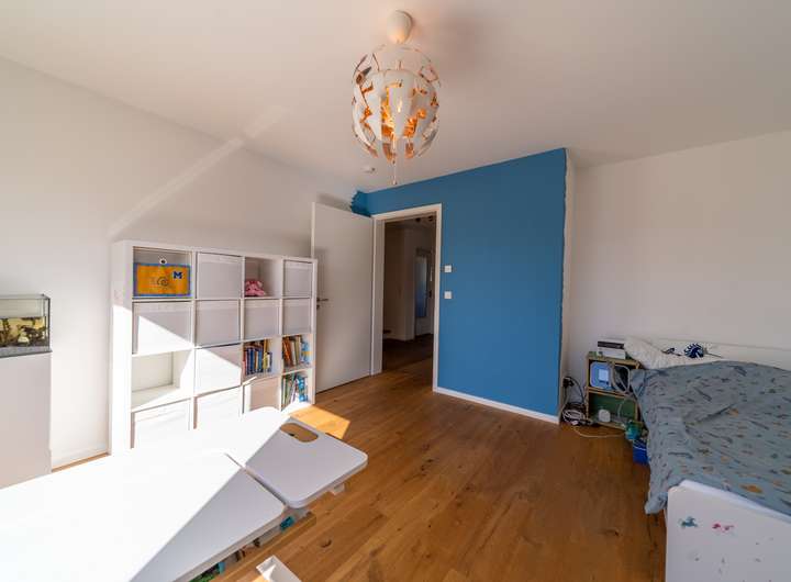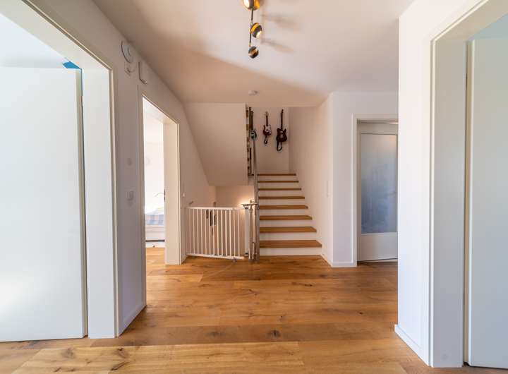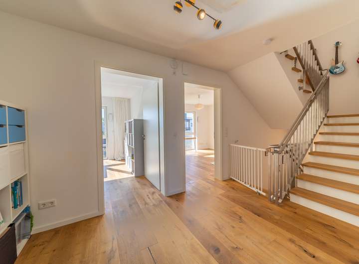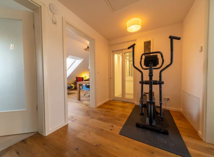 Im Dachgeschoss befinden sich drei weitere Zimmer sowie ein Bad mit ebenerdig gefliester Dusche und Anschlüssen für Waschmaschine und Trockner. Die Schlafzimmer verfügen über verlängerte Dachfenster, die auch hier viel Tageslicht in die Räume bringen. Der offene Flurbereich bietet zusätzlichen Platz für individuelle Nutzung – aktuell als Sportfläche gestaltet. Auch im Dachgeschoss wurde Landhausdielenparkett in Eiche verlegt.